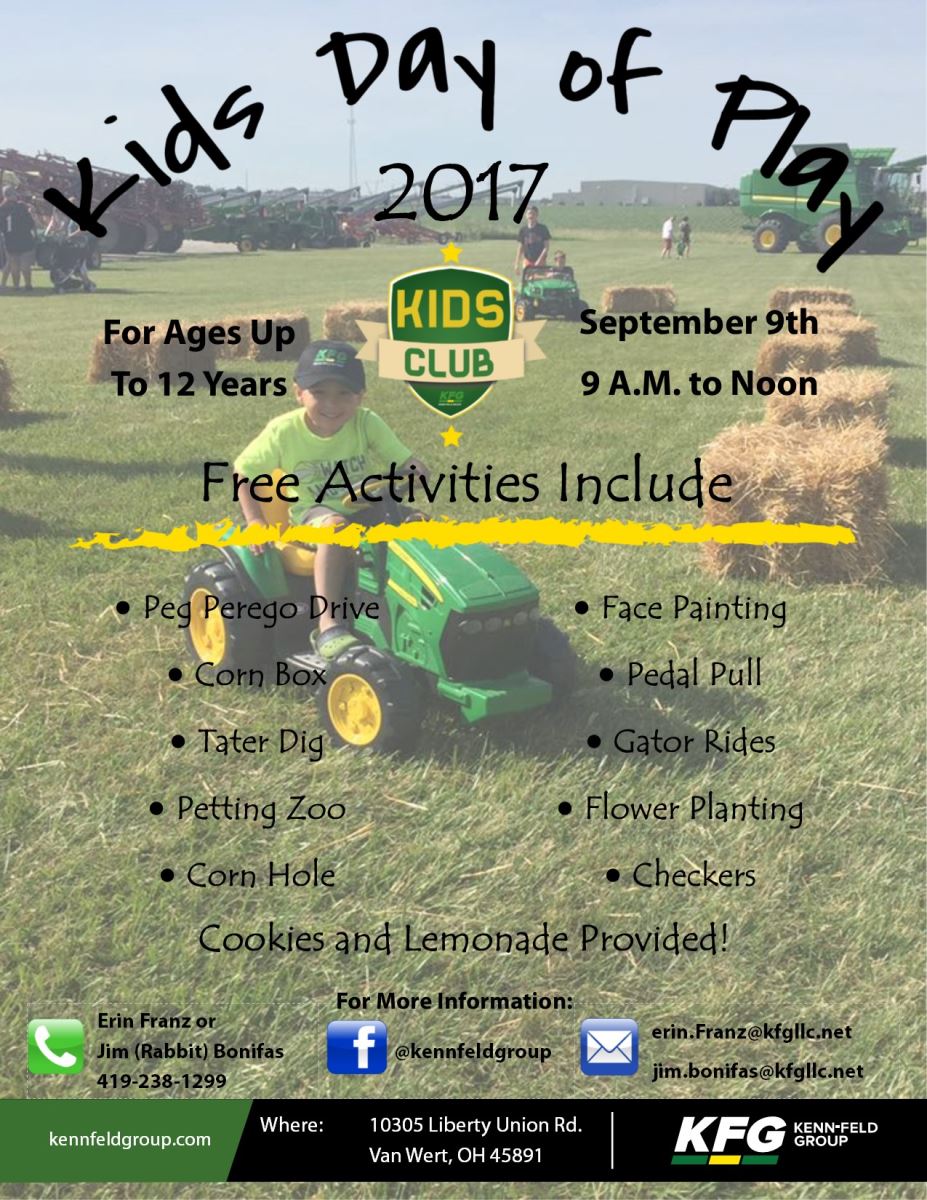 Please join us for our first Van Wert Kids Day of Play, a free event, on Saturday, September 9th, 9 a.m. to noon. We will have a wide range of events for children up to 12 years of age. Below is the list of events we are planning on hosting at this event.